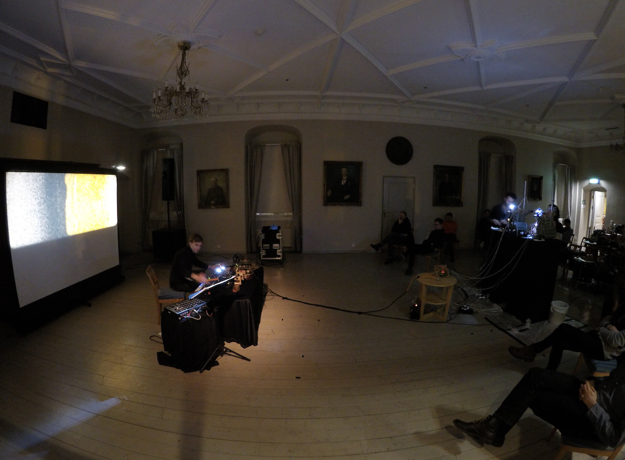 Trioer is an audio-visual installation and live performance where customized 16mm-film projectors and electroacoustic instruments are weaved together in an intricate, yet intuitive system where audio triggers image and vice versa. The projectors are equipped with a modified printer system, simultaneously painting on the film while projecting it on the walls. Analog electroacoustic music crosses paths with rhythmically shifting drone-techno, framed by engaging and ever-evolving visuals.